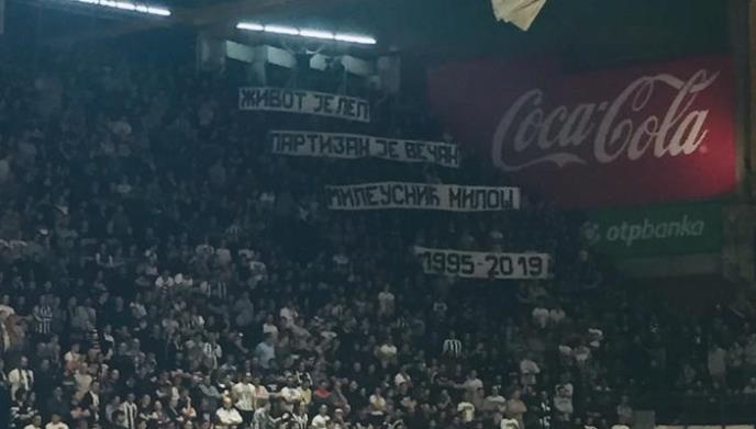 "Život je lep, Partizan je večan, Mileusnić Miloš, 1995-2019", poručili su "Grobari", dok je na drugom transparentu pisalo: