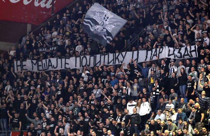 Navijači Partizana imali su dva transparenta tokom prvog poluvremena derbija 19. kola regionalne ABA košarkaške lige protiv Budućnosti.
