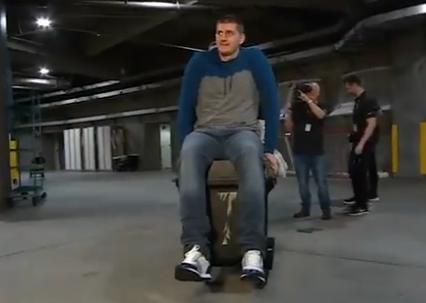 Jokić je naočigled kamera seo na kolica i pozirao pred domaćim fanovima, dok ga je gospodin iza gura.