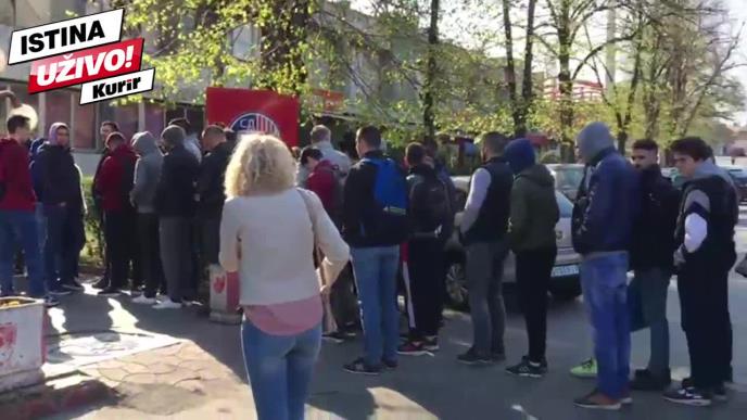Navijači Crvene zvezde od ranih jutarnjih sati čekaju u redu kako bi preuzeli besplatne ulaznice za treći odlučujući meč polufinala regionalne ABA košarkaške lige u kojem se crveno-beli sastaju sa Partizanom.