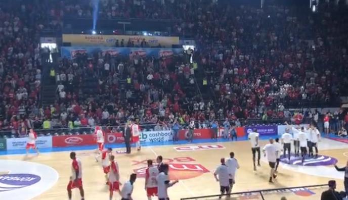 Kada su košarkaši Partizana izašli na parket na zagrevanje dočekani su zvižducima i salvom uvreda, ali nijedan predmet nije upao na teren!