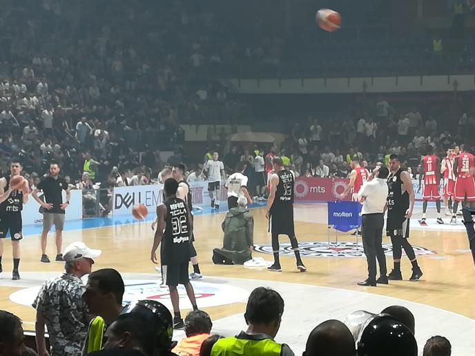 Košarkaški "večiti" derbi u dvorani "Aleksandar Nikolić" prekinut je u 32. minutu pri vođstvu Partizana od 56:55.