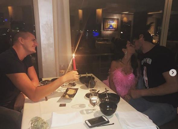 Srpski košarkaš Boban Marjanović, kome je danas 31. rođendan, ljubi svoju lepšu polovinu, suprugu Milicu, a Jokić, koji sedi za stolom preko puta njih im drži sveću.