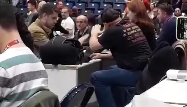 Jedan navijač je došao za novinarski sto u majici ruskog kluba i šalom Partizana pa je moralo da reaguje i obezbeđenje koje je došlo da ga izvede iz hale.