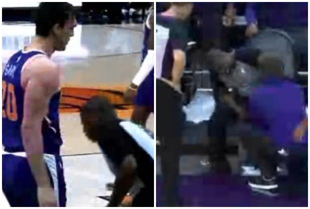 Najpre se košarkaš Čikaga Denzel Valentajn zakucao u njega i srušio ga na parket, a onda ga je as Finiksa Dario Šarić zakucao loptom u međunožlje.