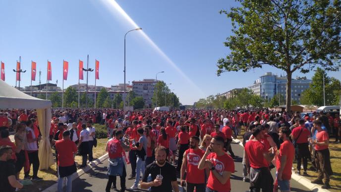 SVI U CRVENO-BELOM: Navijači Olimpijakosa i Crvene zvezde u velikom broju stigli ispred Arene Izvor: Kurir