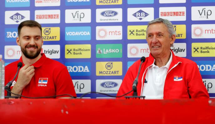 Selektor Svetislav Pešić i reprezentativac Marko Gudurić nasmejali su novinare na današnjoj konferenciji za medije.