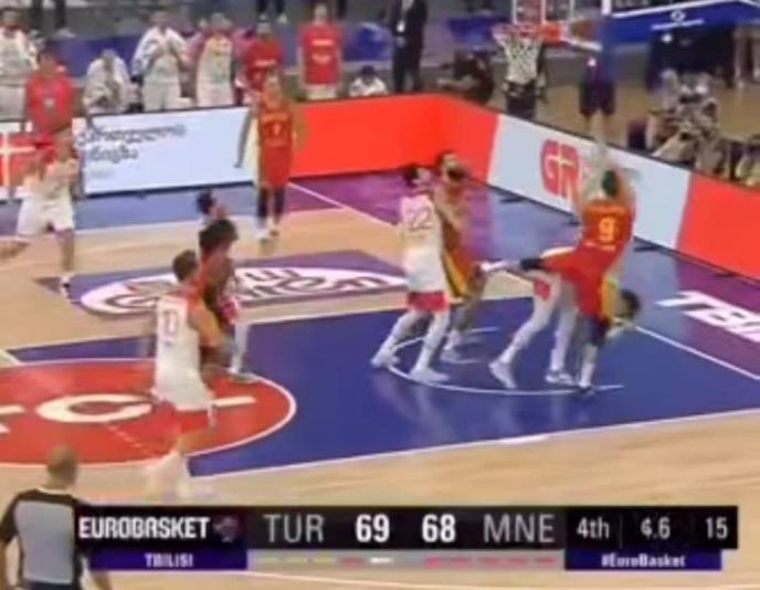 U dramatičnoj završnici naše komšije su imale priliku za trijumf. Naime, Crnogorci su imali napad pri rezultatu 69:68 za Tursku, Mihailović je promašio otvoren šut, skok ubeležio Simonović, ali onda mu je dosuđen faul u napadu.
