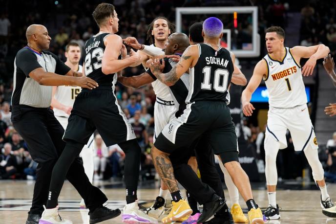 Susret San Antonija i Denevera nije mogao da prođe bez čarki na parketu, pa je tako viđen i jedan incident u kojem su morali da razdvajaju zavađene strane.