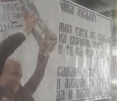 Iznad fotografije na kojoj je trener Partizana sa visoko podignutim peharom stoji poruka "samo hrabro, donesite nam pobedu".