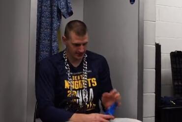 "Sjajan posao, 23 poena i 12 skokova. Želim ovo da dam Nikoli Jokiću", rekao je Meloun i stavio Srbinu oko vrata ogroman lanac sa grbom kluba, koji posle svake utakmice dodeljuje igraču koji se najviše istakao u odbrani.