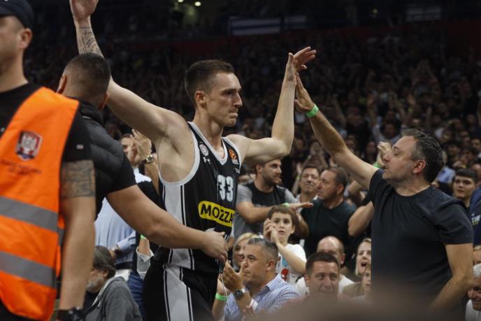 Košarkaši Partizana, zajedno sa blizu 20.000 navijača, skočili su u samoj završnici prvog poluvremena evroligaškog večitog derbija.