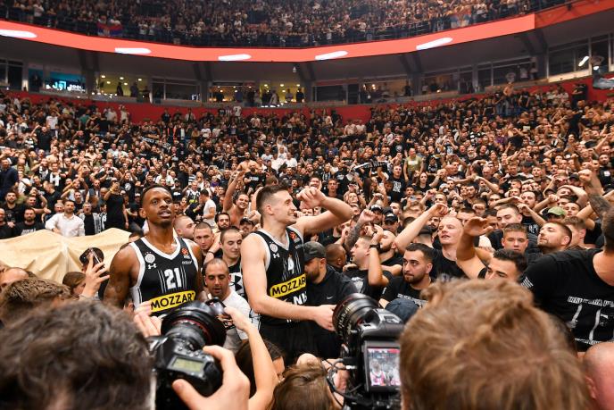 Košarkaši Partizana sa vernim navijačima proslavili su trijumf u prvom ovosezonskom večitom derbiju.