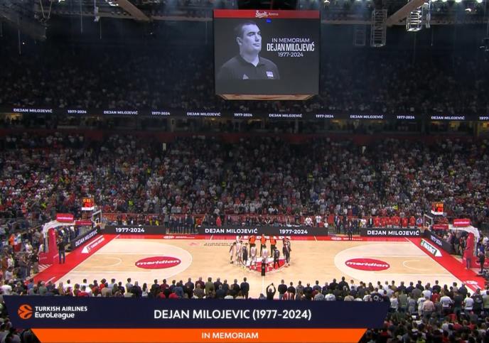 Utakmica Crvena zvezda - Baskonija u Evroligi počela je minutom ćutanja za Dejana Milojevića, tragično preminulog srpskog košarkaškog terena.