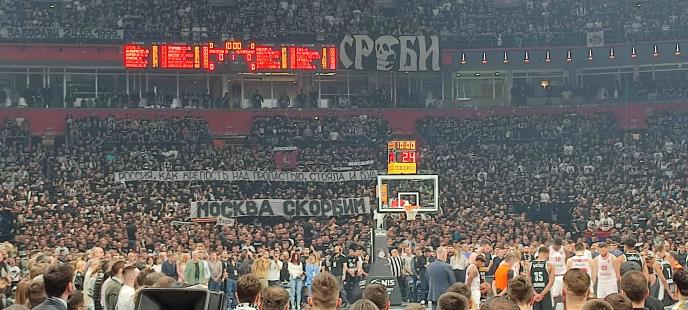 Grobari su razvili transparent na kojem je bio napisan stih iz čuvene ruske pesme: Rusija je kao tvrđava nad ponorom, stajala je i stajaće...