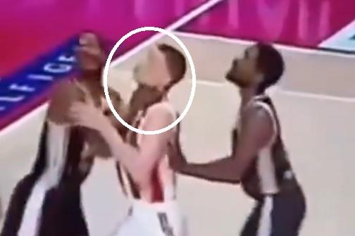 Partizanov Amerikanac nije ni gledao u pravcu lopte, već je za gušu uhvatio Lazarevića koji je ostao u čudu zbog ovog poteza.