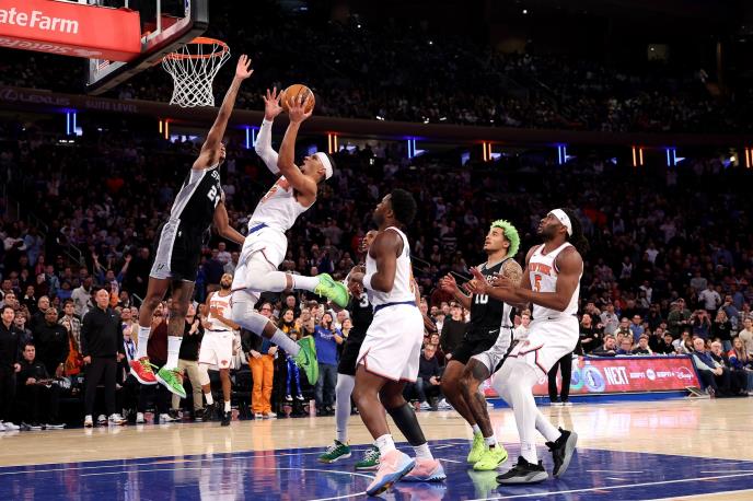 Košarkaši Njujork Niksa pobedili su na svom terenu San Antonio sa 117:114 (28:27, 23:31, 37:25, 29:31), čime su zabeležili peti uzastopni trijumf u Američkoj profesionalnoj košarkaškoj ligi (NBA).