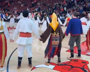Pred utakmicu Čikago - Denver u čuvenom "Junajted centru" mladići i devojke obučeni u našu narodnu nošnju zaigrali su srpsko kolo na parketu.