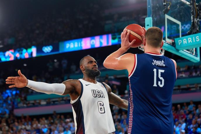 Nikola Jokić i Lebron Džejms na meču Srbija - SAD na Olimpijskim igrama u Parizu Foto: Baptiste Autissier / imago sportfotodienst / Profimedia, Tilo Wiedensohler / imago sportfotodienst / Profimedia