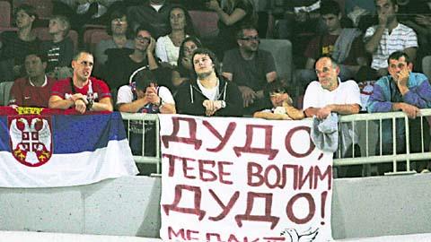 LJUBLJANA - Čuveni hit Ljubiše Stojanovića Luisa "Dudo, tebe volim, Dudo" inspirisao je navijače Srbije da istovetan transparent podrške selektoru Dušanu Ivkoviću okače na tribinama hale u Ljubljani, gde srpski košarkaši igraju drugu fazu Evrobasketa.