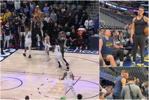 Zanimljivo, njega je prvi na terenu dočekao Nikola Jokić, koji je i ovaj meč zbog povrede ispratio sa klupe. Nikola je odradio zagrevanje, proćaskao malo sa bivšim saigračem na terenu, a onda obukao odelo i sa klupe ispratio meč.