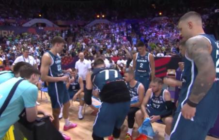 Pokušavao je Luka na sve moguće načine da razdrma ekipu, pa je tako na jednom tajm-autu preuzeo i ulogu trenera. Dok je selektor Aleksandar Sekulić sa pomoćnicima smišljao šta i kako dalje, Luka je uzeo tablu i objasnio saigračima šta treba da rade.