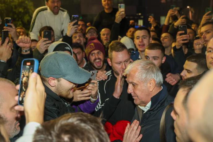 Navijači Partizana na aeodromu "Nikola Tesla" u Beogradu dočekali su Željka Obradovića, koji je sleteo iz Atine sa željom da ga ubede da promeni svoju odluku i povuče ostavku.