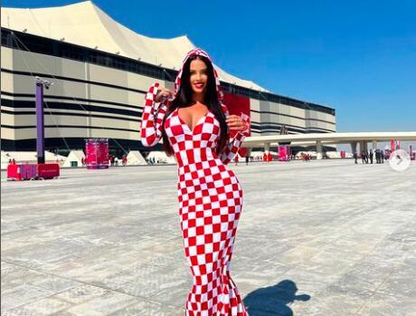 Čim se pojavila ispred stadiona Al Bajat nastala je prava pometnja. Njen provokativni stajling raspametio je sve prisutne. Pojavila se u uskoj dugoj haljini sa hrvatskom šahovnicom, a u prvom planu bio je njen savršeni dekolte.