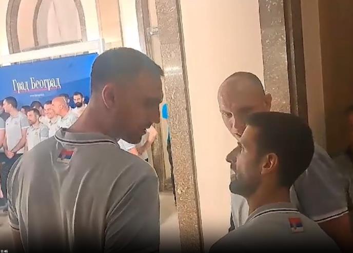 Đoković je posle osvajanja US opena stigao iz Njujorka u Beograd i požurio da veliki uspeh proslavi sa srebrnim "orlovima" i navijačima. Kada je Novak stigao u Stari dvor prišao je s leđa Nikoli Milutunovu i Dejanu Davidovcu.