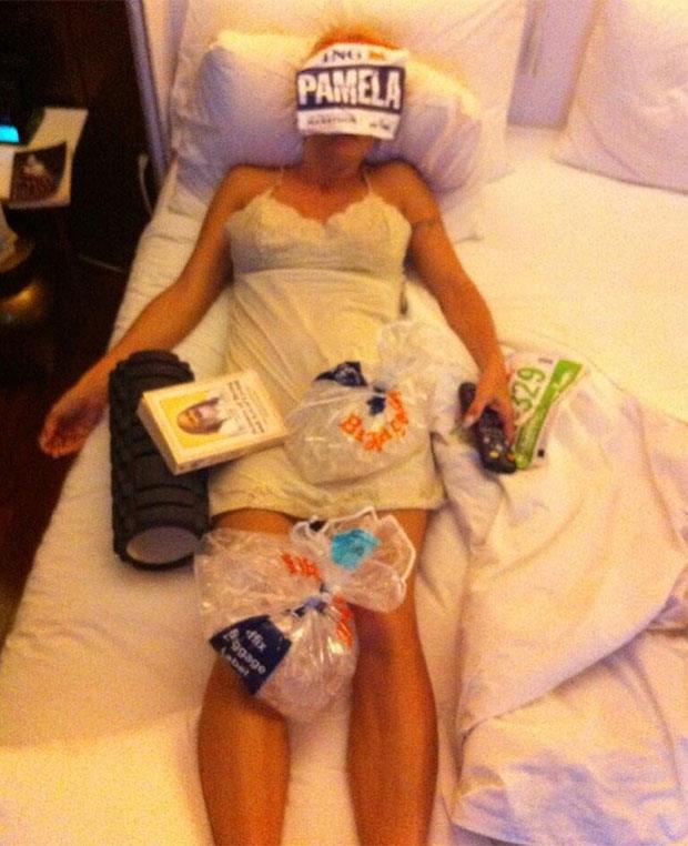 Bivša Plejboj zečica je po završetku trke rekla da je bilo naporno trčati maraton, a na društvenim mrežama objavila je sliku gde se vidi da leži na krevetu i hladi se ledom.