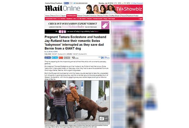 Ekleston, koji je pre tri dana otišao sa mesta šefa "najbržeg cirkusa na svetu" zbog optužbi za davanje mita, boravio je sa trudnom ćerkom Tamarom i zetom u Švajcarskoj. U trenutku dok je zastao da se slika sa nepoznatom ženom, zaskočio ga je sa leđa pas koji je veći od njega. Fotografije možete pogledati ovde.