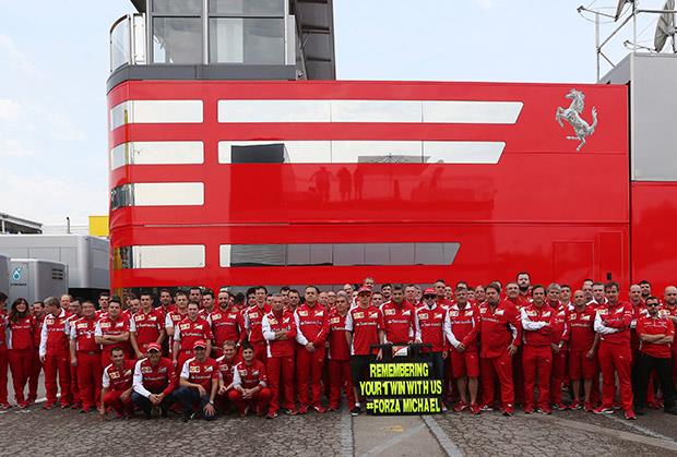 Vozači Fernando Alonso i Kimi Raikonen, zajedno s novim direktorom ekipe Marko Matijačijem i oko 100 članova ekipe okupili su se ispred parole na kojoj je napisano: "Sećamo se tvoje prve pobede za nas, napred Mihael".