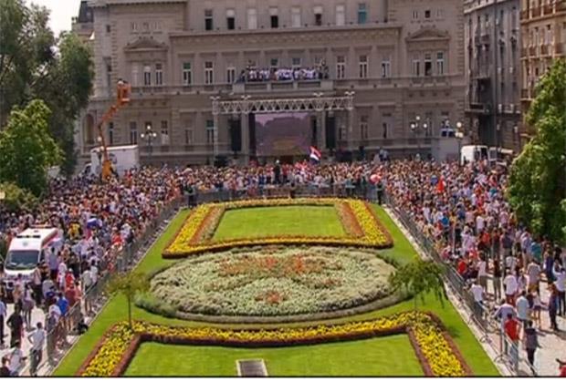 Na balkonu ispred Starog dvora održan je svečani doček zlatnih vaterpolista, koji su u nedelju u Budimpešti osvojili titulu prvaka Evrope pošto su pobedili Mađarsku rezultatom 12:7.