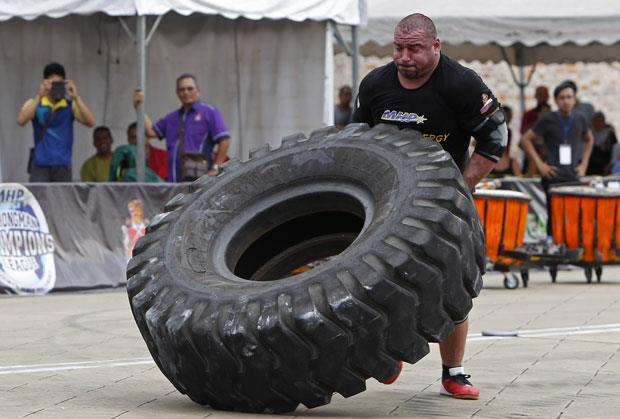 Reč je o prevrtanju gumenih točkova (Tire Flip) teških 440 kilograma na terenu od 20 metara