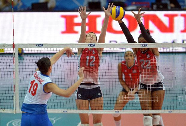 Amerikanke su na početku prvog seta povele sa 4:1, ali su srpske odbojkašice uspele da preokrenu na 5:4. Njihove protivnice su na prvi tehnički tajm-aut otišle vođstvom od 8:6 i do sredine seta su čuvale prednost. Ekipa Zorana Terzića je uspela da se vrati u igru (21:21), ali su Amerikanke iskoristile greške protivnica i povele u meču.