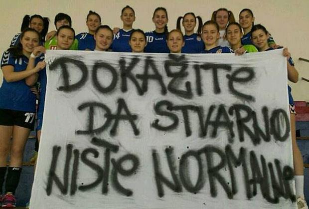 Na okupljanju u hali "Slodes", generacija rođena 1996. godine razvila je transparent "Dokažite da stvarno niste normalne". One su aludirale na pesmu koja je bila jedan od pokretača dobre atmosfere za vreme Svetskog prvenstva prošle godine, kada je Srbija osvojila srebrnu medalju, uz poruku "Mi verujemo".