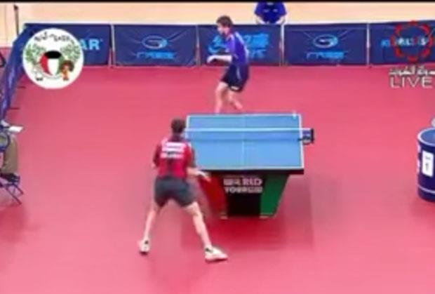 Jedan od igrača je vratio lopticu preko mreže, a drugi stonoteniser je uzvratio neverovatnim potezom. On je okrenut leđima vratio lopticu na protivničko polje i osvojio poen.