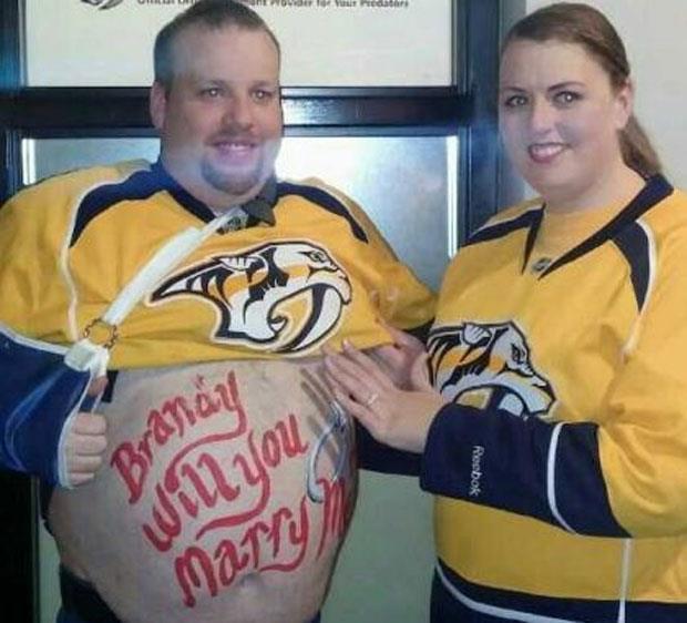 On je iskoristio meč Nešvila i Nju Džersija da zaprosi devojku, a to je učinio na jedinstven način. On je na svom ogromnom stomaku napisao: Brendi, hoćeš li da se udaš za mene?