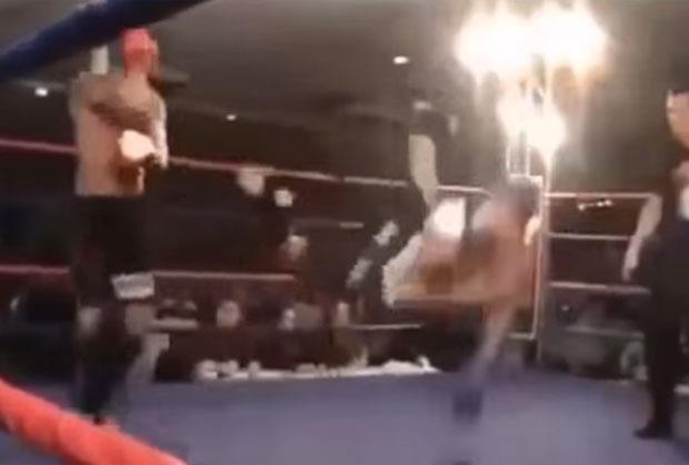 Jedan do boraca je pokušao da napravi dobar udarac nogama. Međutim, njegov protivnik se sklonio, a ovaj je žestoko pao na pod.