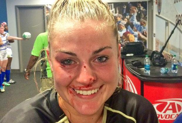 There is tough, then there is rugby tough. Lindenwood Women's player breaks her nose and stays on the field to make a try saving tackle. Give this girl a LIKE! See more at USA Sevens Rugby #respect #rugbytough