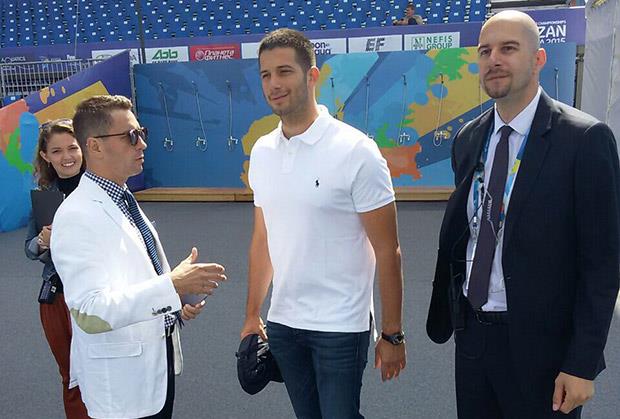 Udovičića je dočekao ministar sporta Tatarstana Vladimir Leonov i generalni sekretar Organizacionog komiteta FINA-e Ranko Tepavčević, sa kojima je obišao skakaonice na otvorenom i univerzitetsko selo u kome borave sportisti.