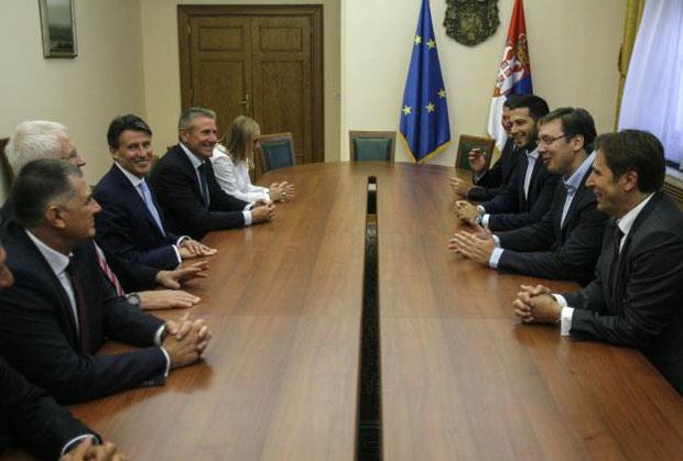 BEOGRAD - Predsednik Vlade Republike Srbije Aleksandar Vučić i ministar omladine i sporta Vanja Udovičić sastali su se danas sa članovima delegacije Svetske atletske federacije (IAAF) na čelu sa predsednikom federacije Sebastijanom Kouom.
