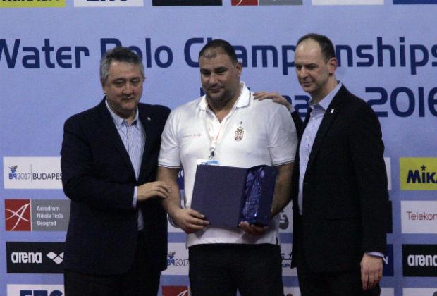 Njemu je nagradu u Beogradskoj areni uoči utakmice trećeg kola Evropskog prvenstva Srbije i Francuske uručio predsednik Evropske plivačke unije (LEN) Paolo Bareli.