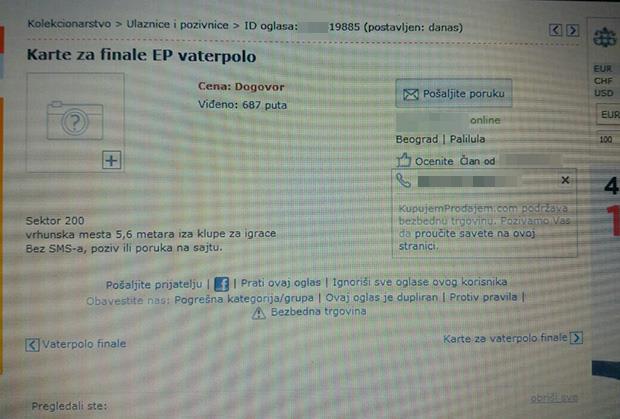 Na internetu se uveliko nude ulaznice za finale. Čitaoci Kurira su pronašli preprodavce, a jedan od njih traži 200 evra za dve ulaznice za kako kaže vrhunska mesta na tribinama.