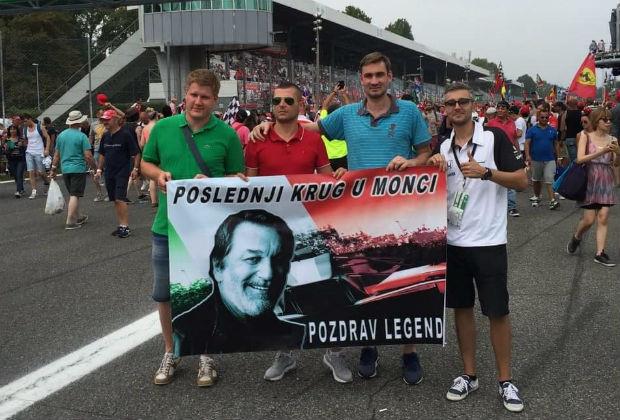Na zastavi četvorice Lozničana, pored lika slavnog Nikolića, pisalo je "Poslednji krug u Monci - pozdrav legendi".