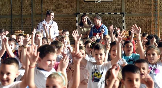 SPORT ČUVA ZDRAVLJE DECE: Milica Mandić, Damir Mikec i Aleksandar Kukolj na času sa prvacima Foto: OKS