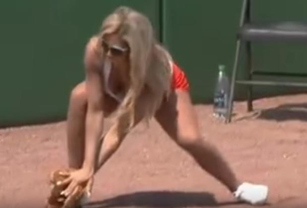 Posao ove plavuše je da hvata loptice koje odlete predaleko na utakmicama bejzbol lige.