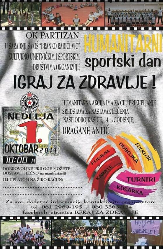 Odbojkaški klub Partizan u saradnji sa OŠ “Branko Radičević”, kulturno umetničkim i sportskim društvima, organizuje humanitarno sportski dan “Igraj za zdravlje”.