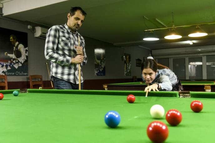 Ali, zarazno je i super gotivno. U bilijar klubu "Mister S", koga drži naš najbolji snukeraš Marko Stoilković, uslovi za ovu igru koju sam oduvek želeo da probam su idealni. Upoznao sam Mariju, kažu da odlično igra. Hm, da probamo jedan frejm...