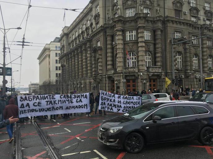 Prethodno se ispred zgrade Vlade Srbije okupilo nekoliko desetina navijača, koji su blokirali Nemanjinu ulicu, protestujući zbog rukometne utakmice koja je trebalo da se odigra između ženskih juniorskih timova Srbije i tzv. Kosova.